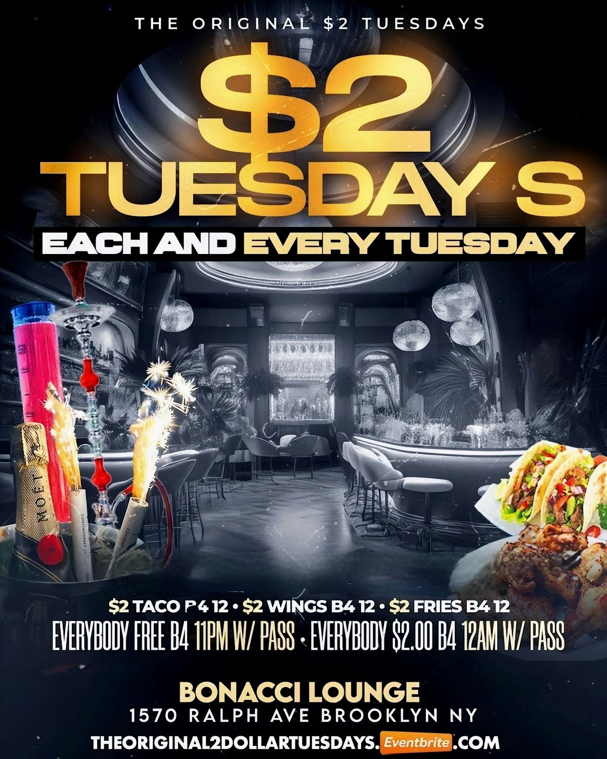 Welcome to $2 TUESDAYS EACH & EVERY TUESDAY at Bonacci Lounge! Join us every Tuesday for a night of fun and great deals. Enjoy $2 specials on select drinks and Food all night long. Bring your friends and unwind after a long day at work. Don't miss out on this awesome weekly event!