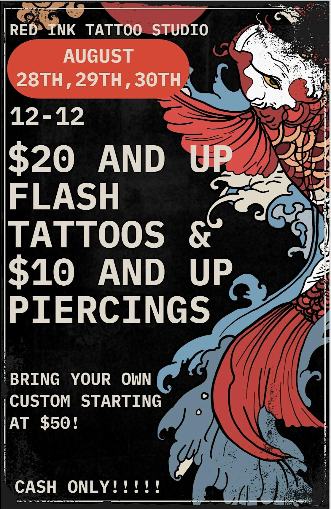 Hey there ink lovers! Get ready for an exciting event at Redink Tattoo Studio onAUGUST 28TH, 29TH, AND 30TH 2026 at 12:00 PM! We're offering flash tattoos starting at $20 and piercings starting at $10. Come join us for a day filled with creativity and self-expression. See you there!