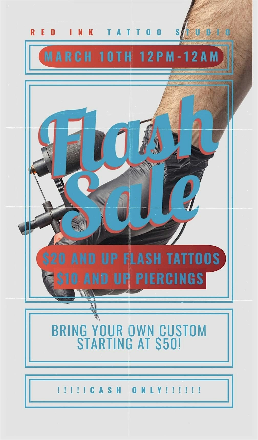 Hey there ink lovers! Get ready for an exciting event at Redink Tattoo Studio on March 10th! 2025 at 12:00 PM! We're offering flash tattoos starting at $20 and piercings starting at $10. Come join us for a day filled with creativity and self-expression. See you there!