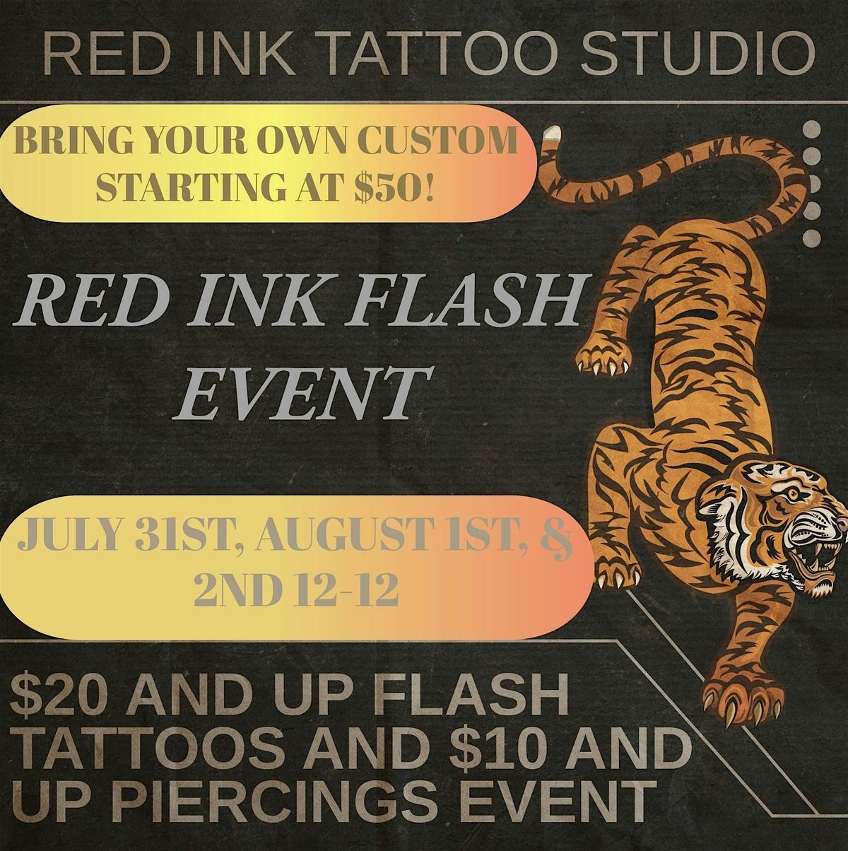 Hey there ink lovers! Get ready for an exciting event at Redink Tattoo Studio on J JULY 31ST, AUGUST 1ST, AND 2ND 2026 ! at 12:00 PM! We're offering flash tattoos starting at $20 and piercings starting at $10. Come join us for a day filled with creativity and self-expression. See you there!