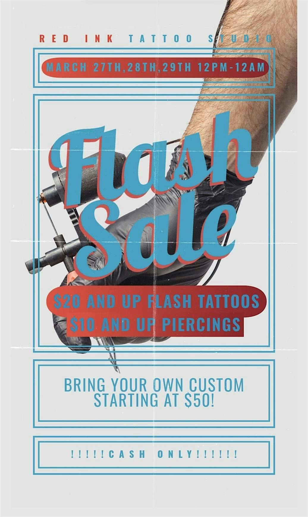 Hey there ink lovers! Get ready for an exciting event at Redink Tattoo Studio on MARCH 27TH, 28TH, 29TH! We're offering flash tattoos starting at $20 and piercings starting at $10. Come join us for a day filled with creativity and self-expression. See you there!