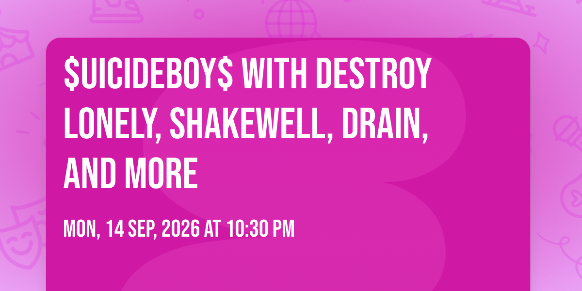 📍 Location: 43.6292, -79.4152✨ Enter a world of endless possibilities at $uicideboy$ with Destroy Lonely, Shakewell, Drain, and more, where every moment tells a story! 🏛️ The stunning RBC Amphitheatre in vibrant Toronto, ON transforms into a realm of wonder on September 14th, 2026 at 10:30 PM. 🌟 They have crafted an experience that goes beyond the ordinary, combining elements of surprise, delight, and pure entertainment. Every detail has been thoughtfully considered to ensure your journey with us is nothing short of extraordinary. 🎯 Join fellow adventure seekers and memory makers in this celebration of imagination and innovation. 🎊 Reserve your spot today and be part of something truly special!
