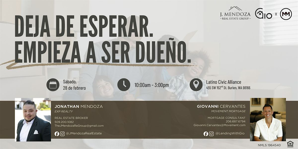 Únete a el agente de bienes raíces de confianza, Jonathan Mendoza, y al experto en préstamos hipotecarios, Giovanni Cervantes, para una clase divertida, informativa y dinámica para compradores de casa por primera vez, aprobada por la Comisión de Financiamiento de Vivienda del Estado de Washington (WSHFC).