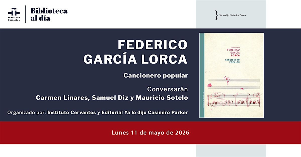 En colaboración con la editorial Ya Lo Dijo Casimiro Parker, el Instituto Cervantes organiza un encuentro en torno a la obra Cancionero popular, de Federico García Lorca. Participarán Carmen Linares, una de las grandes voces del flamenco contemporáneo; Samuel Diz, guitarrista e investigador de la música española; y Mauricio Sotelo, uno de los compositores españoles más destacados en la actualidad.