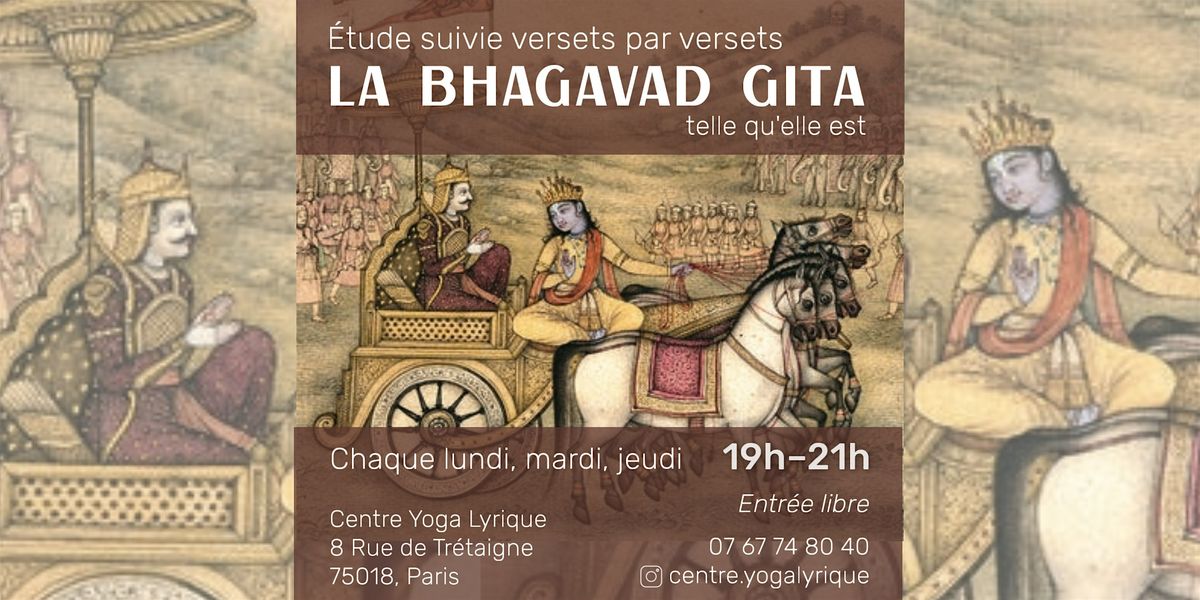 La Bhagavad Gita est un ouvrage vieux de 5000 ans relatant la conversation du guerrier Arjuna à son ami Krishna. Face au dilemme de choisir entre combattre les siens et fuir son devoir, Arjuna prend refuge dans les instructions de Krishna. Leur discussion portant sur le devoir, la liberté, la portée de nos actions et le divin offre à l'humanité l'un des discours philosophiques les plus profonds que l'histoire ait connu. Cette conversation vivante extraite du Mahabharata propose à tous les hommes un chemin menant vers la vérité, l'intégrité et l'essence de l'existence. Yoga Lyrique et ses conférenciers propose une analyse versets par versets de "La Bhagavad Gita telle qu'elle est", version commentée par Bhaktivedanta Swami Prabhupada. Que vous soyez initié à la culture védique ou totalement novice, vous pouvez vous joindre à l'étude en cours sans problèmes.