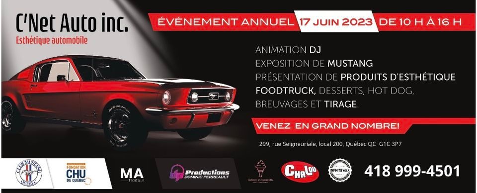 Bienvenue à notre évènement annuel,en cette belle journée,il y aura exposition du Club Mustang de Québec,animation avec DJ Dominic Perreault,food truck crème glacée,hot-dogs,breuvages, présentations des produits Infinity wax,Animascotte avec la Pat’ Patrouille.