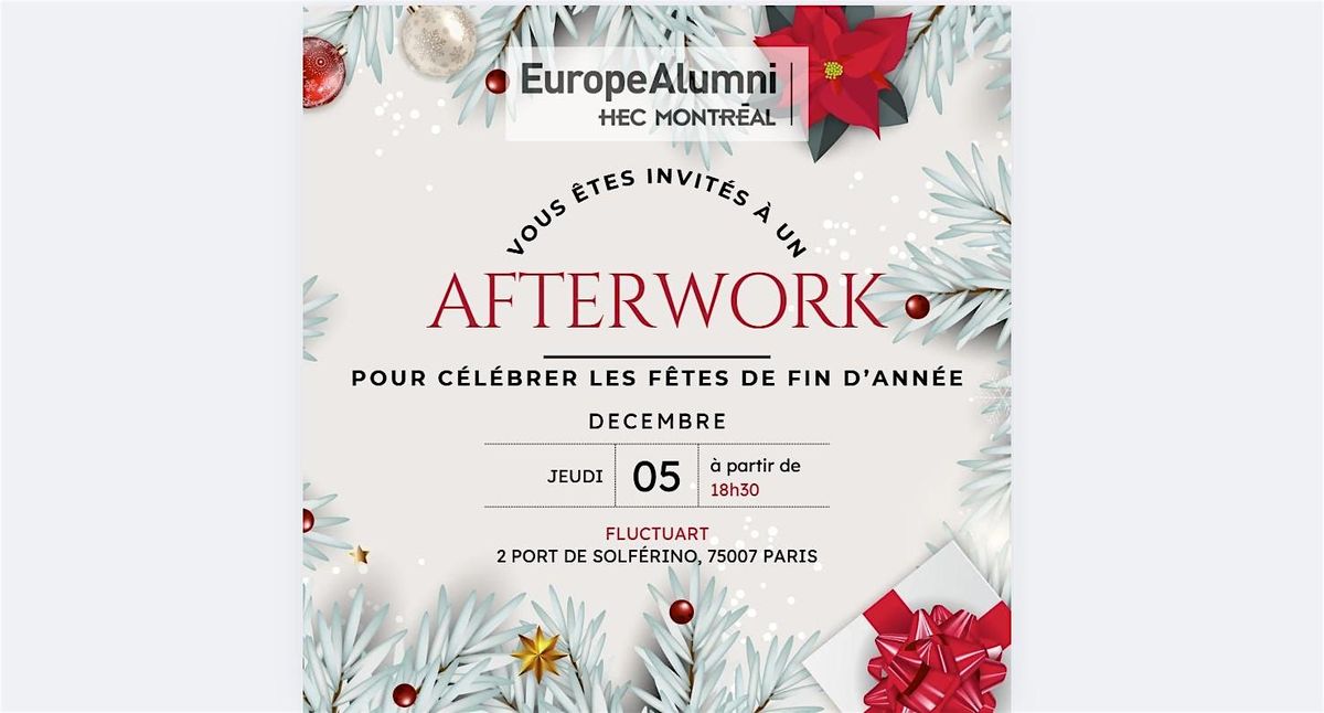 Nous sommes ravis de vous inviter à un afterwork pour célébrer les fêtes de fin d’année ! Ce sera également l'occasion de se réunir et d’accueillir de nouveaux Alumni à Paris. L'événement se tiendra au Fluctuart, 2 Port de Solférino, 75007 Paris.*