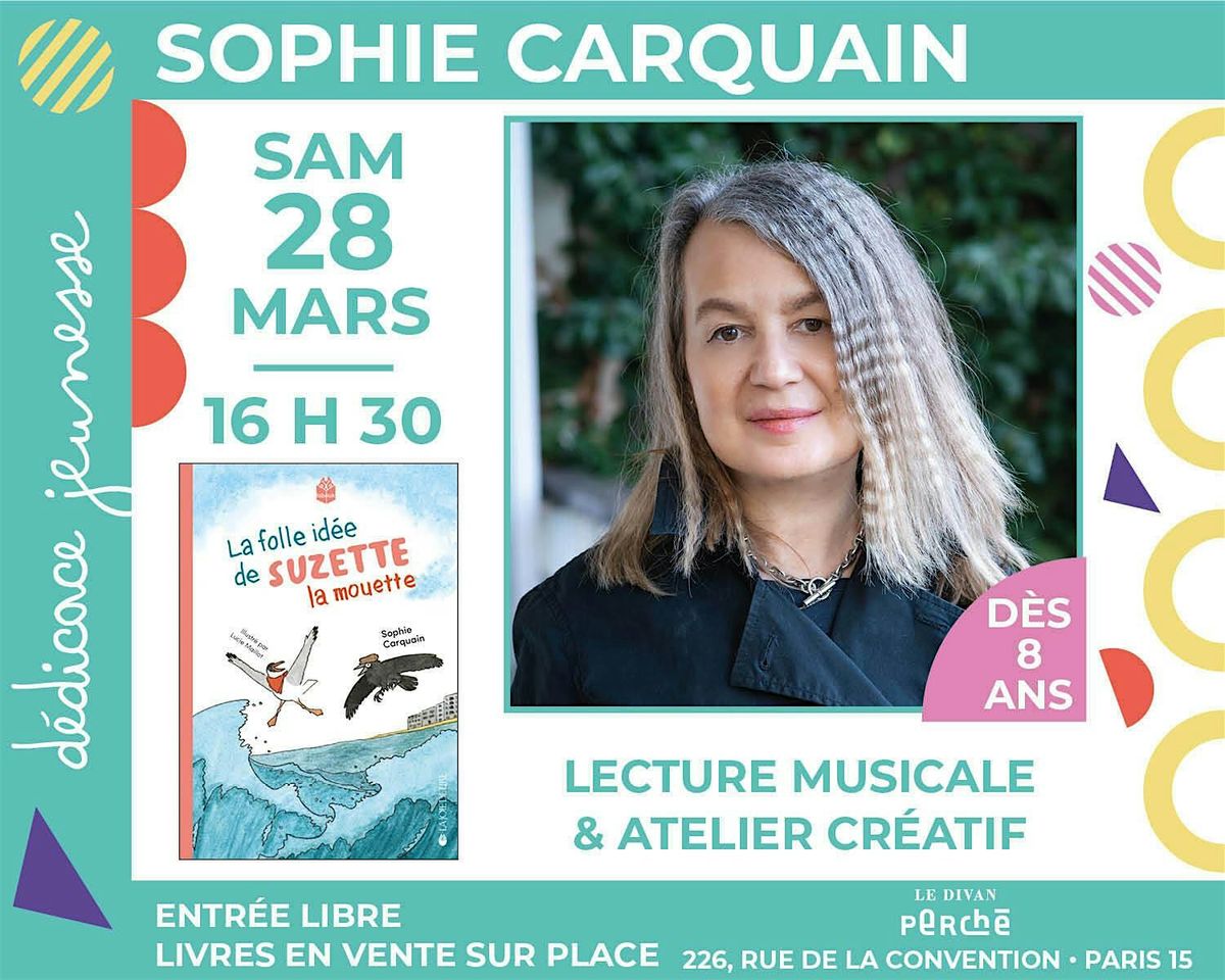 Pour les enfants dès 8 ans !Nous accueillons Sophie Carquain pour une lecture musicale suivi d'un atelier autour de son livre « La Folle idée de Suzette la mouette ». Suzette a une idée de génie : emmener Niko, son ami corbeau, passer quelques jours à la plage auprès de ses amis. Mais ses camarades oiseaux marins ne voient pas d'un bon œil son entente avec un oiseau des villes. Un belle histoire sur l'amitié et la différence.