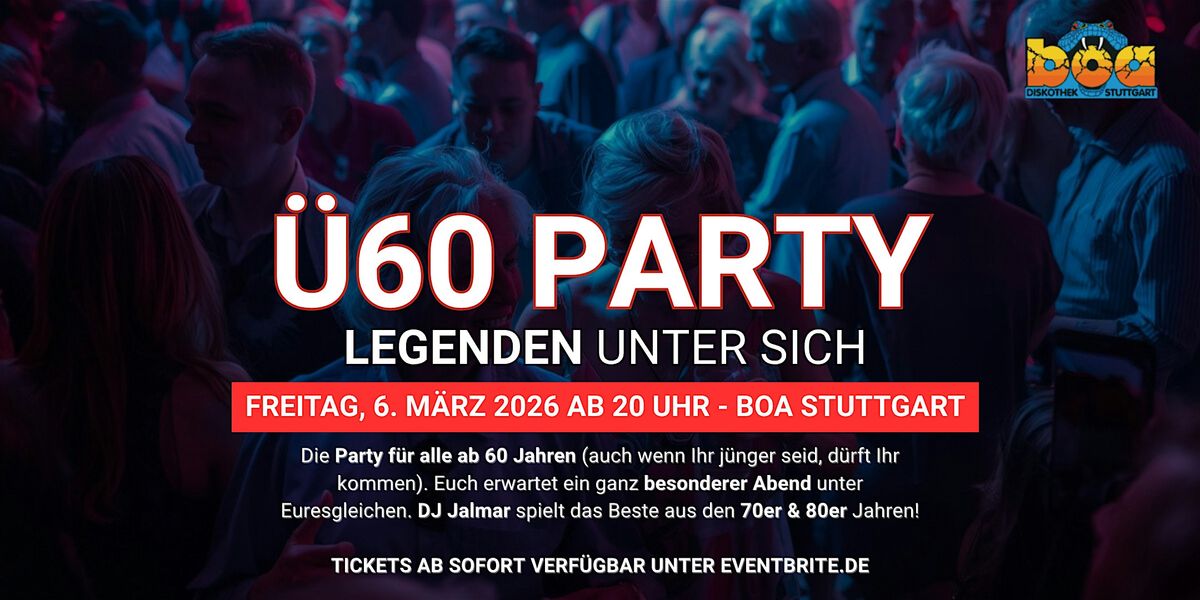 Stuttgart bekommt ein Event für die Generation, die Ausgehen noch richtig gelernt hat: Die Ü60 PARTY – Legenden unter sich. Am 6. März 2026 öffnet die BOA Stuttgart die Türen für alle ab 60 Jahren (und für alle, die jünger sind, aber die richtige Einstellung mitbringen). Es wird ein Abend, an dem Erinnerungen lebendig werden – und neue dazukommen.