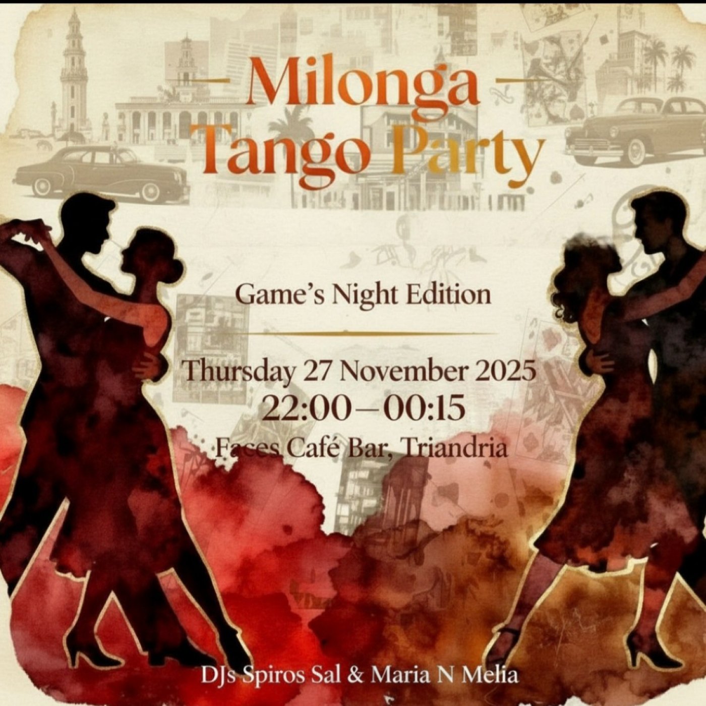 Μετά την απόλυτη επιτυχία της προηγούμενης εβδομάδας η κοινότητα του Αργεντίνικου Τάνγκο στη Θεσσαλονίκη ετοιμάζεται για μια ακόμη μοναδική βραδιά που συνδυάζει τον παθιασμένο χορό με την παιχνιδιάρικη διάθεση. Η Milonga Tango Party — Game's Night Edition επιστρέφει δυναμικά την Πέμπτη 27 Νοεμβρίου 2025 στο αγαπημένο στέκι των χορευτών το Faces Café Bar στην Τριανδρία.