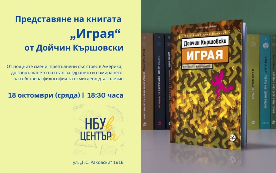 На 18. октомври 2023 г. от 18.30 ч. в книжарница и галерия „НБУ в ЦЕНТЪРа“ (ул. „Г.С. Раковски“ 191Б) ще се проведе представяне на книгата „Играя“ от Дойчин Кършовски.