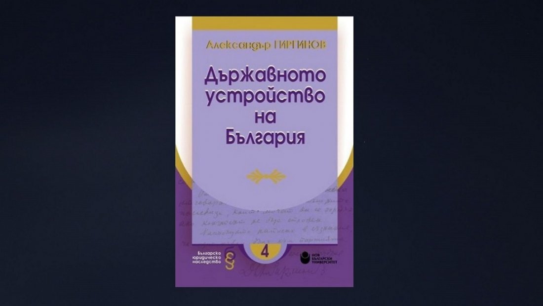 Център за книгата и департамент „Право“ канят на представяне на монографията „Държавното устройство на България“ с автор проф. Александър Гиргинов (под научната редакция на проф. д-р Екатерина Михайлова) поредица „Българско юридическо наследство“ на 7. декември 2021 г. от 16.30 ч. в книжарницата на корпус I в Нов български университет.