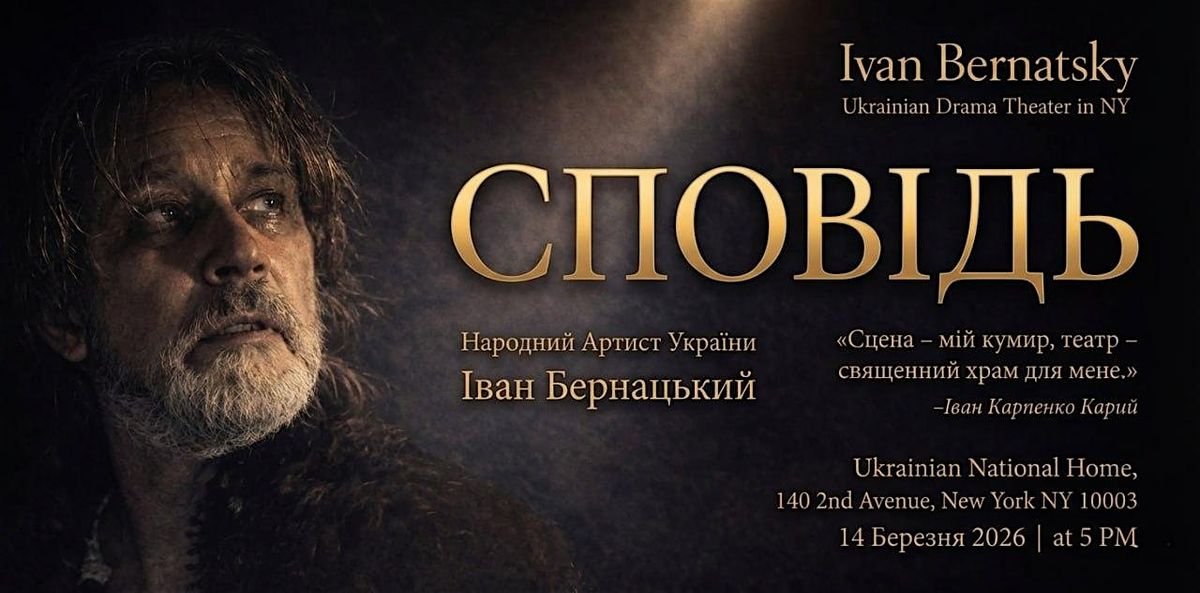 Запрошуємо на унікальний живий показ від Ivan Bernatsky і Українського драматичного театру в Нью-Йорку. Це справжнє театральне дійство, де душевні сповіді оживають на сцені. Не пропусти нагоду поринути у світ справжніх емоцій та історій разом із нами! Приходь, відчуй атмосферу і підтримай українське мистецтво наживо!