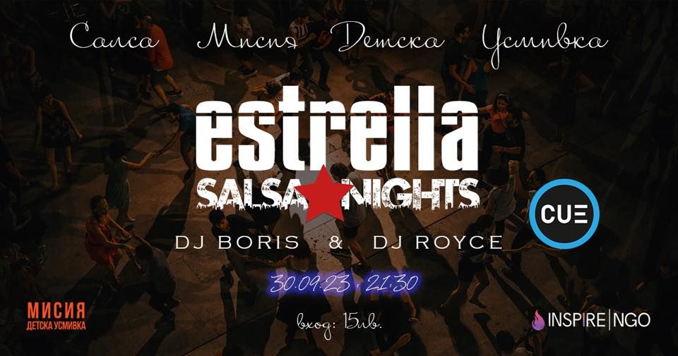 Откриваме есенния сезон на Estrella Salsa Nights със специално издание - Салса Вечер Мисия Детска Усмивка Vol. IIОт 2019та година инициативата "Мисия Детска Усмивка" подпомага центрове за настаняване от семеен тип. Чрез текущата кампания ще се осигурят средства за екскурзия на децата без родителска грижа, настанени в Самоков, да посетят Рилския манастир и околните забележителности във втората седмица на м. октомври.