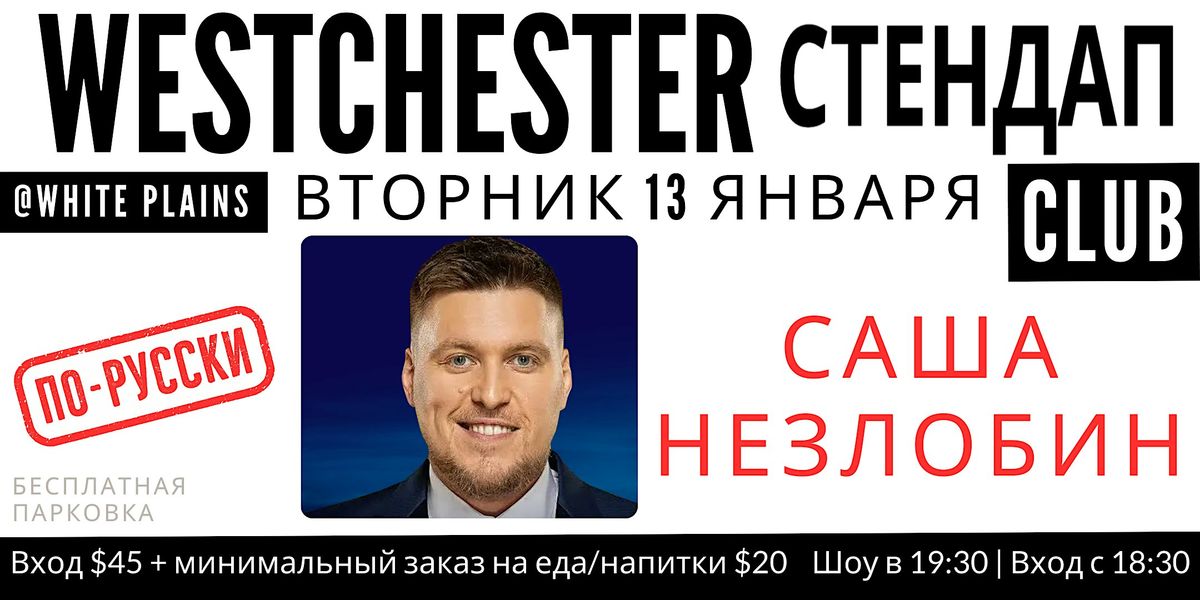 Westchester Comedy Club @ White Plains приглашает вас на вечер стендап-комедии на русском языке от комик Саша Незлобин.