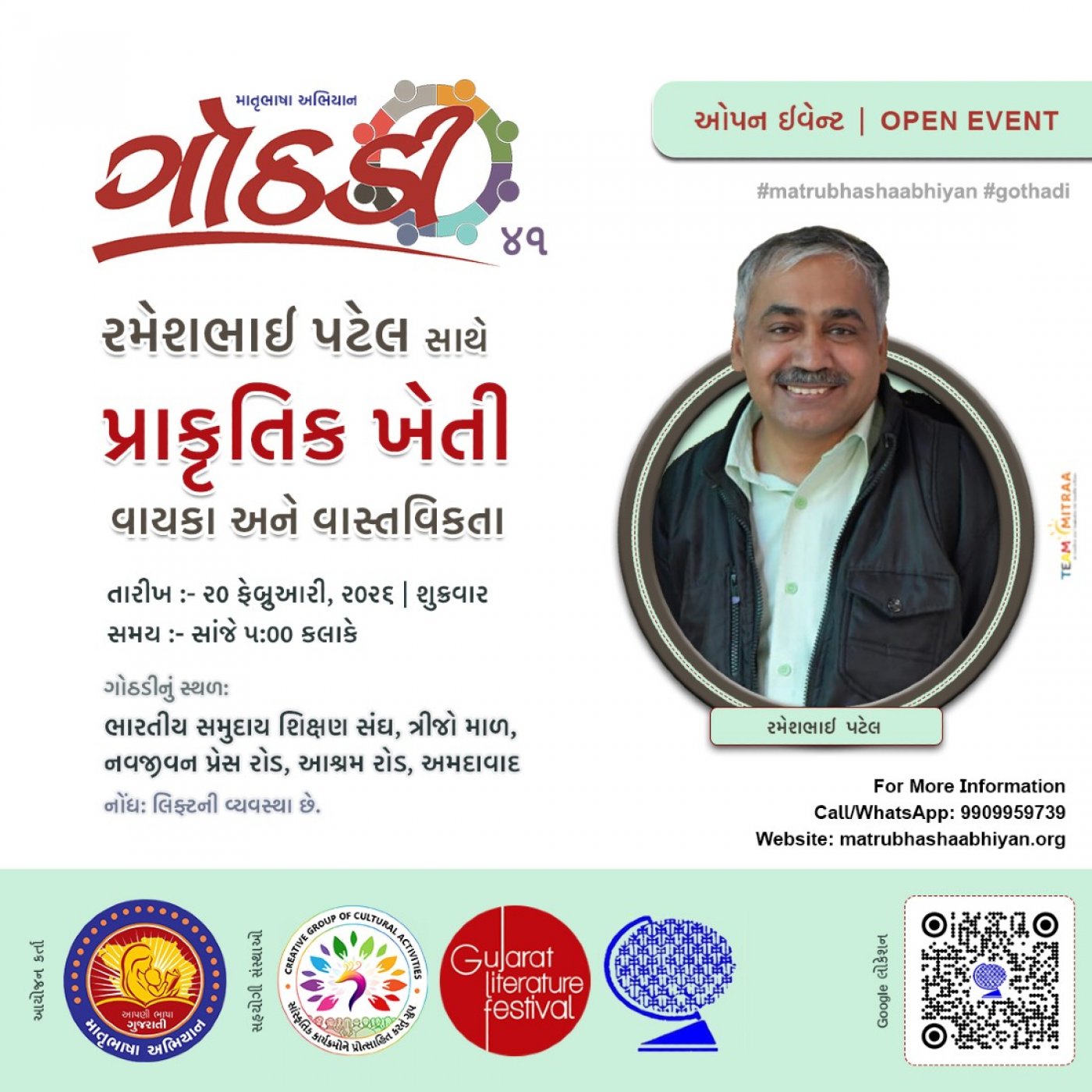 તારીખ ૨૦મી ફેબ્રુઆરીને શુક્રવારના રોજ માતૃભાષા અભિયાન ગોઠડીમાં આપણે વાત કરીશું "પ્રાકૃતિક ખેતી - વાયકા અને વાસ્તવિકતા" ઉપર પ્રાકૃતિક ખેતીના હિમાયતી અને સમર્થક તેમજ સૃષ્ટિ ઈનોવેશન્સના મેનેજિંગ ડિરેક્ટર રમેશભાઈ પટેલ સાથે.... ગોઠડીમાં પધારવા ભાવભર્યું આમંત્રણ છે.