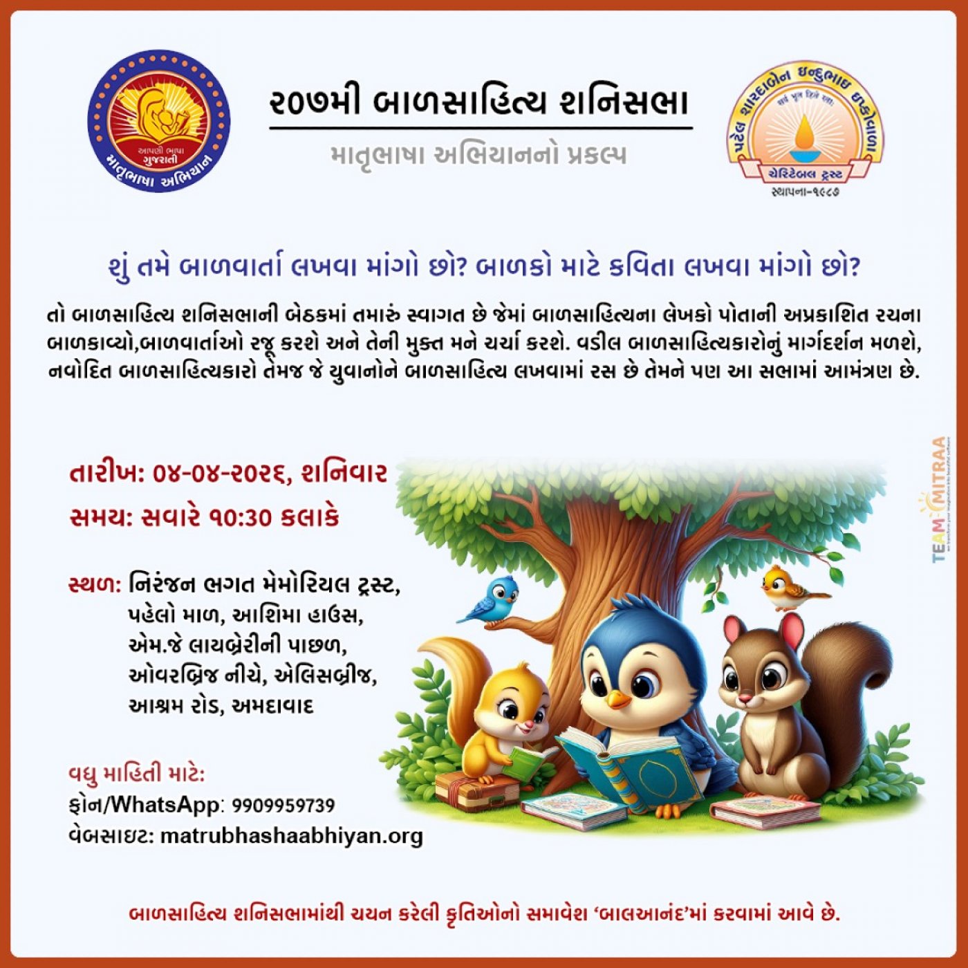 આપ પણ બાળસાહિત્ય સાથે સંકળાયેલા હોય અથવા બાળકો માટે કંઈક લખવા માંગતા હોવ તો બાળસાહિત્ય શનિસભામાં આપનું સ્વાગત છે.