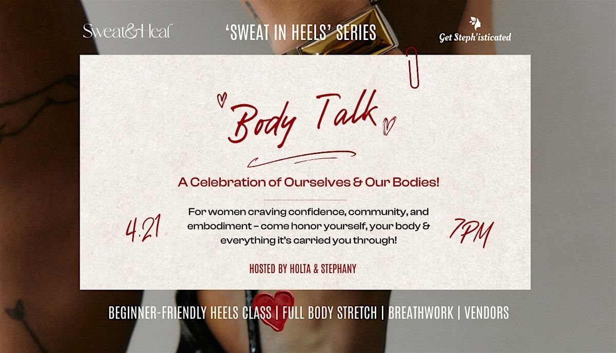 Sweat in Heels: Body Talk is a high-energy, beginner-friendly heels dance experience designed to get you out of your head and fully into your body.