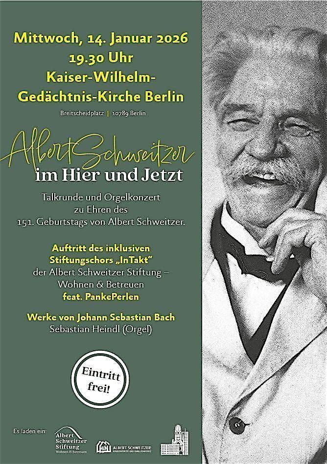 Wie können die Werte Albert Schweitzers heute, in einer Zeit voller Wandel und Herausforderungen, Orientierung und Halt geben? Dieser Frage widmet sich die Albert Schweitzer Stiftung – Wohnen & Betreuen in ihrer diesjährigen Gedenkveranstaltung am 14. Januar 2026 in der Kaiser-Wilhelm-Gedächtnis-Kirche. Unter dem Motto „Albert Schweitzer im Hier und Jetzt“ möchte die Stiftung ab 19.30 Uhr aufzeigen, wie Schweitzers Vermächtnis auch heute Menschen verbindet und wie seine Werte ganz konkret in der täglichen Arbeit gelebt werden.