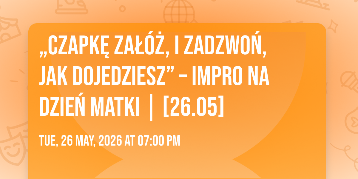 Od kilku do kilkunastu godzin na porodówce, nieprzespane noce, tymczasowa niechęć do seksu – czas spłacić choćby ułamek długu, jaki zaciągnęliśmy wobec naszych ukochanych matek, pojawiając się na świecie. Dlatego w Dzień Matki (ten kalendarzowy, bo przecież matki powinny mieć swoje święto co dzień) zaproście swoje rodzicielki, opiekunki, ciotki, przyjaciółki, które same doświadczyły „cudu macierzyństwa”, albo tych, którzy po prostu są córkami lub synami, i spędźcie ten wieczór w Klubie Komediowym!Zagramy dla was improwizowany spektakl inspirowany historiami o mamach, matkach chrzestnych, madkach i Matkach Polkach. Na pewno nie raz słyszeliście zdania: „Czapkę załóż, i zadzwoń, jak dojedziesz”, „Dzwonisz tylko, jak czegoś potrzebujesz”, „Masz tam co jeść w tej Warszawie” – a ile matek, tyle złotych myśli, cennych porad i kultowych cytatów.