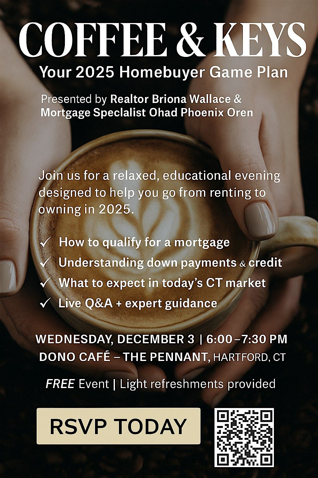 Dreaming of homeownership in 2026? Join us for a relaxed and informative evening at Dōno Café in Hartford. Enjoy coffee, tea, and pastries while learning how to navigate the homebuying process from two local experts who help Connecticut buyers every day.