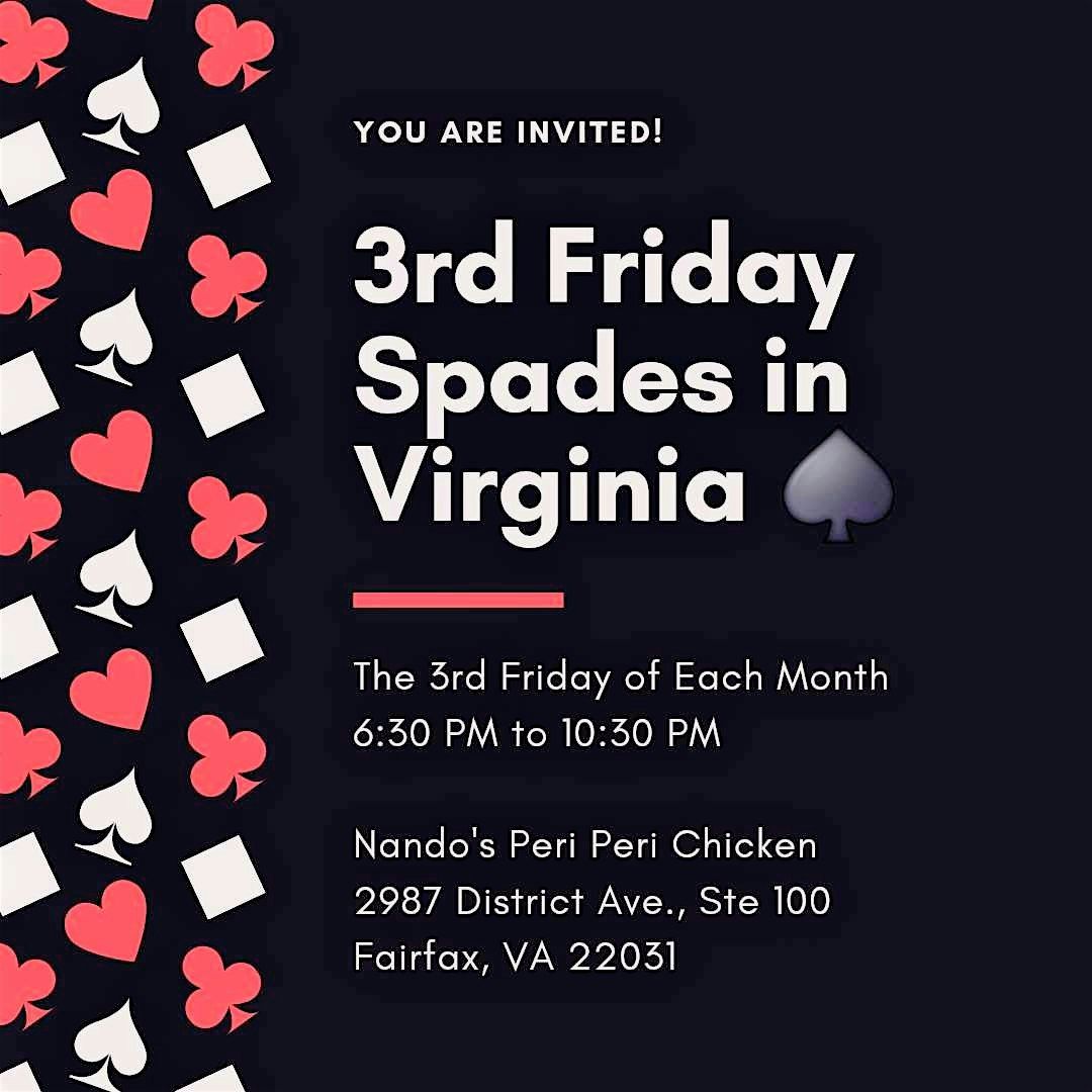 3rd Friday Spades in VA! Join the DMV Spades Meetup Group https://www.meetup.com/spades-246. All skill levels are welcome. RSVP Today!