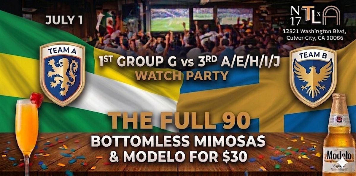 The knockout stage begins. Watch 1st Group G vs 3rd A/E/H/I/J live at the FIFA World Cup 2026 Round of 32 at N17 The Lane — Culver City's premier soccer bar and one of the best places in Los Angeles for a true World Cup 2026 watch party experience.