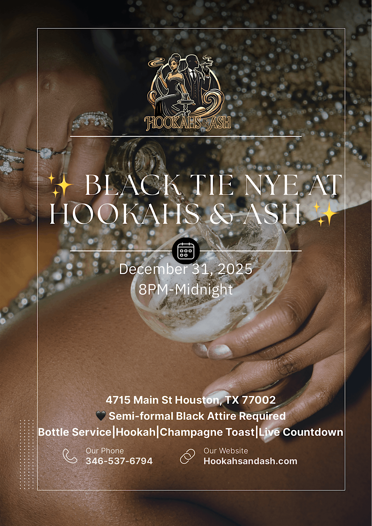 Step into 2026 with elegance and luxury at our Black Tie Hookah Gala — a grown and bougie New Year’s Eve experience curated for Houston’s finest.