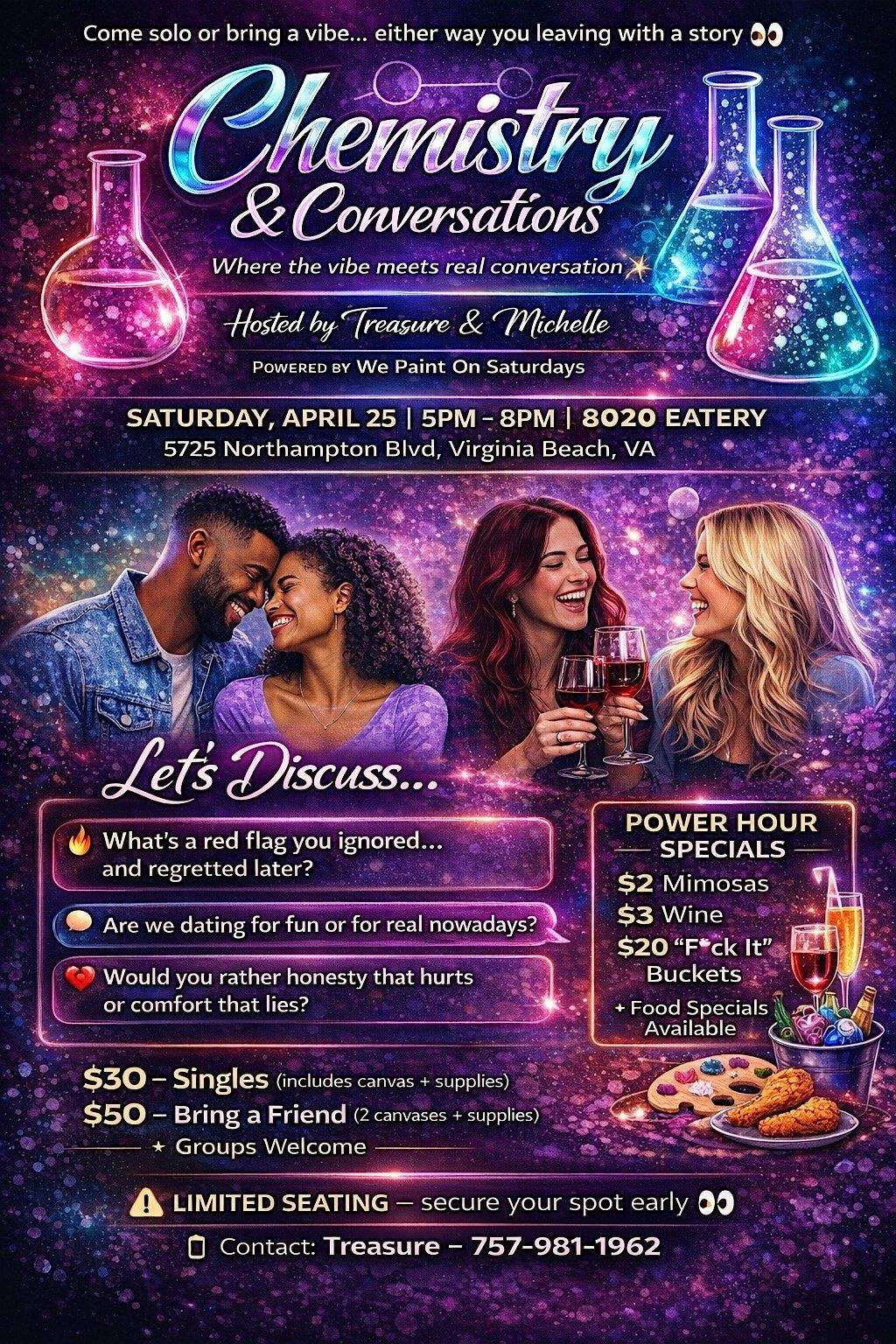 Chemistry & Conversations is where paint, drinks, and real conversations come together. Whether you’re single, bringing a friend, or just outside looking for something new — this is your sign to pull up.