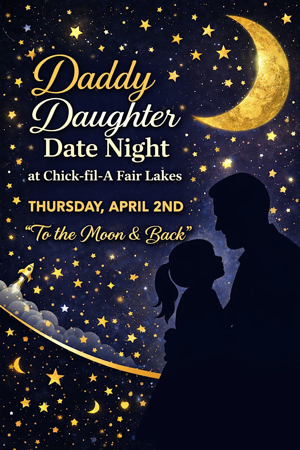 Join us for a special evening at Chick-fil-A Fair Lakes celebrating the sweet bond between dads and daughters! Dress up and enjoy a magical night under the stars with our “To the Moon & Back” theme filled with fun, laughter, and memorable moments together.