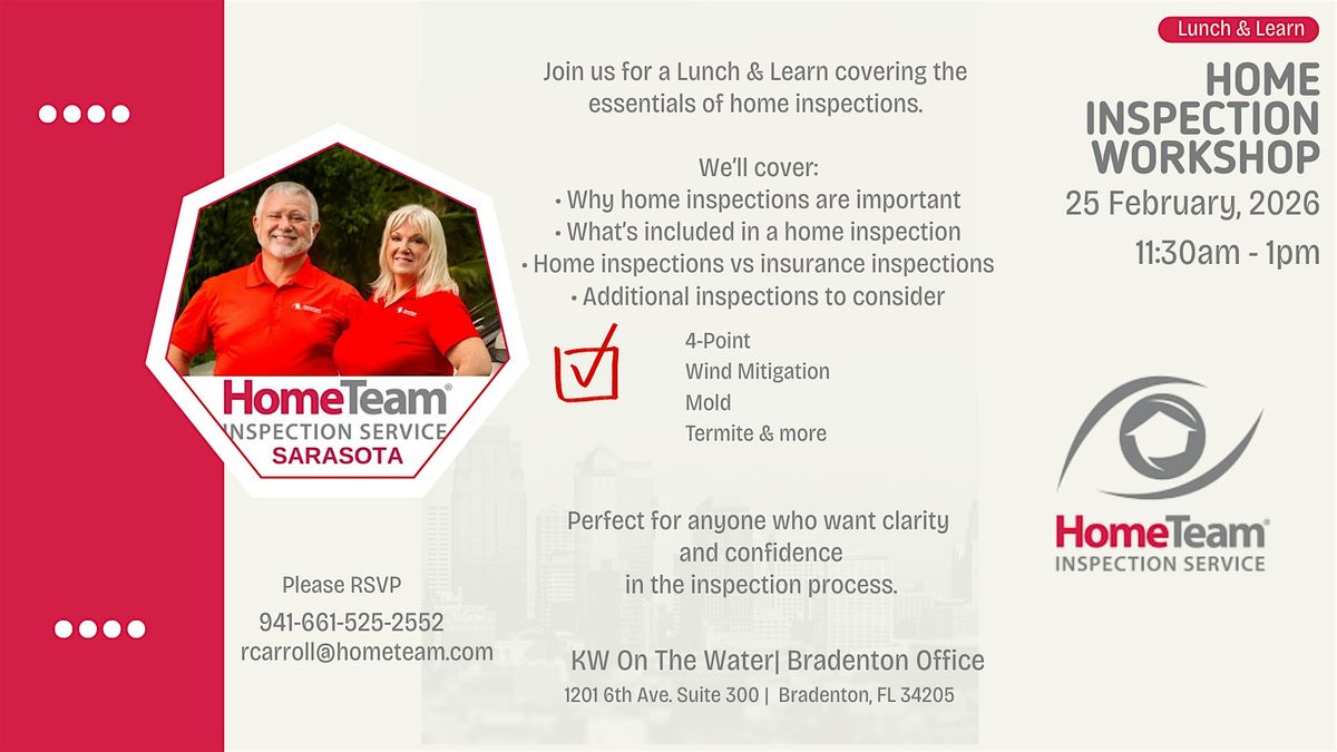 Lunch & Learn: Home Inspection Workshop Feb 25 | 11:30–1 at KW Bradenton. Learn inspections, 4-point, wind mitigation & more! RSVP today.