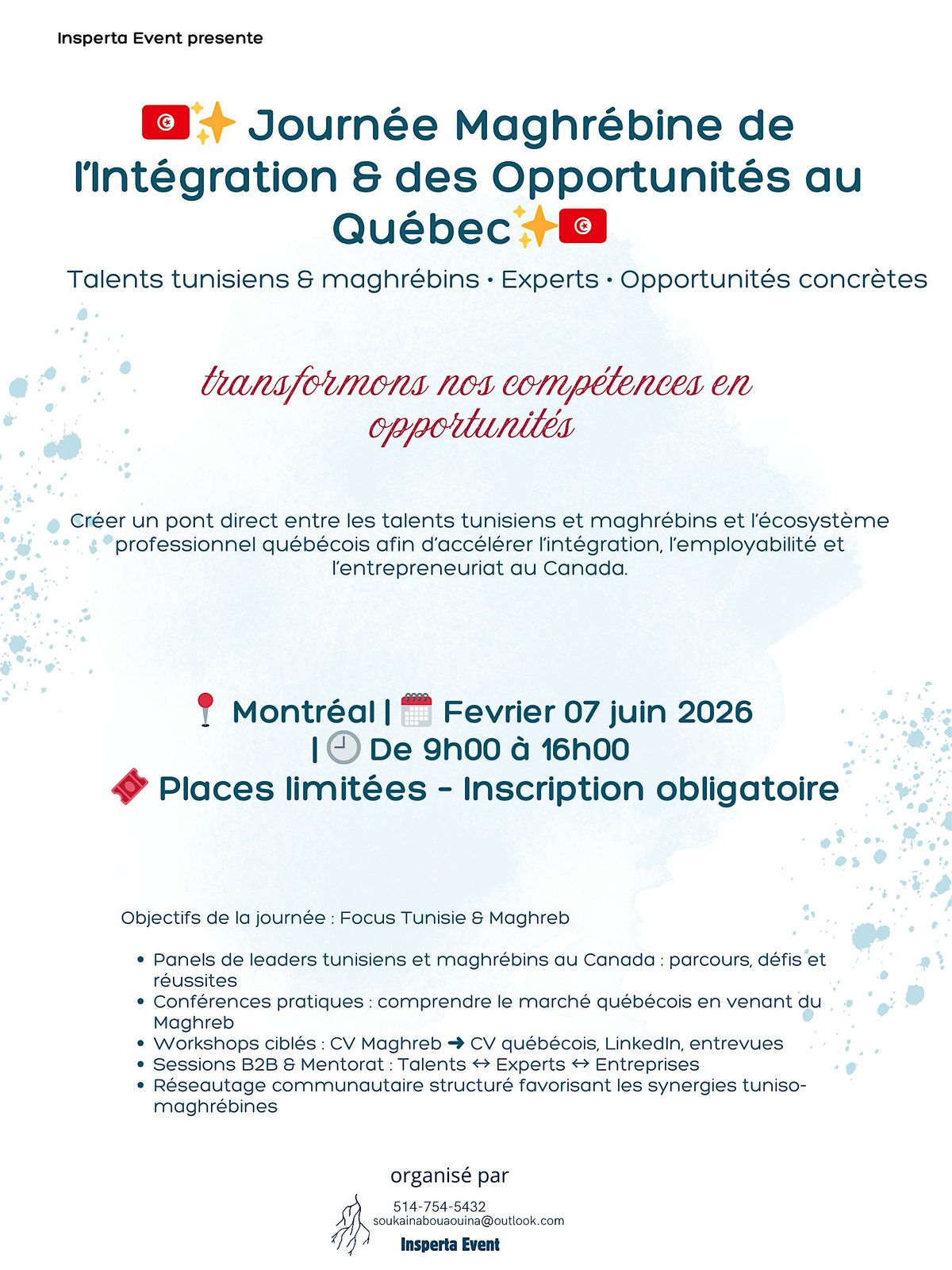 Créer un pont direct entre les talents tunisiens et maghrébins et l’écosystème professionnel québécois afin d’accélérer l’intégration, l’employabilité et l’entrepreneuriat au Canada.