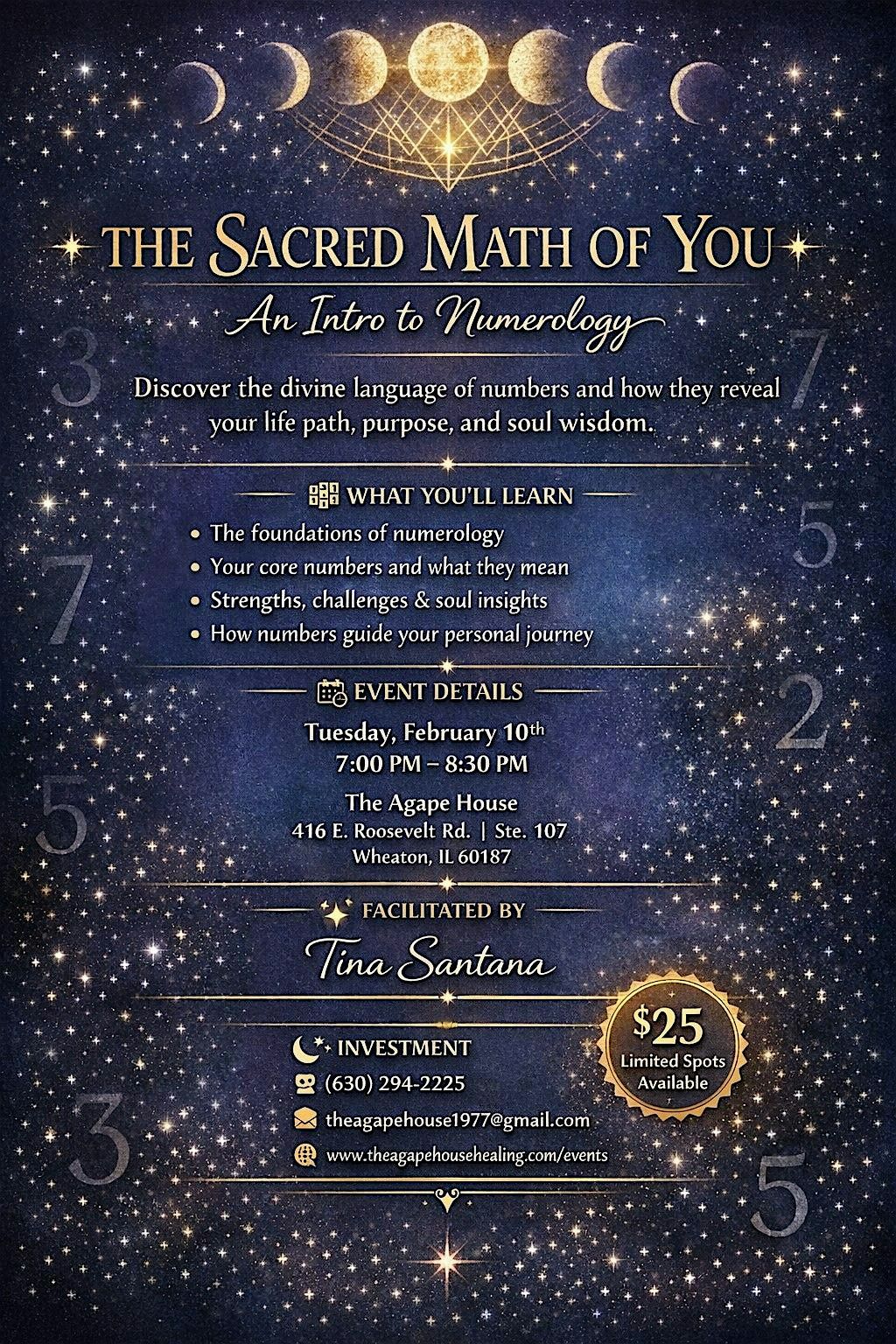 Come with an open heart and curious mind. You'll leave with powerful insights into your soul's design—guided by the sacred vibration of numbers.