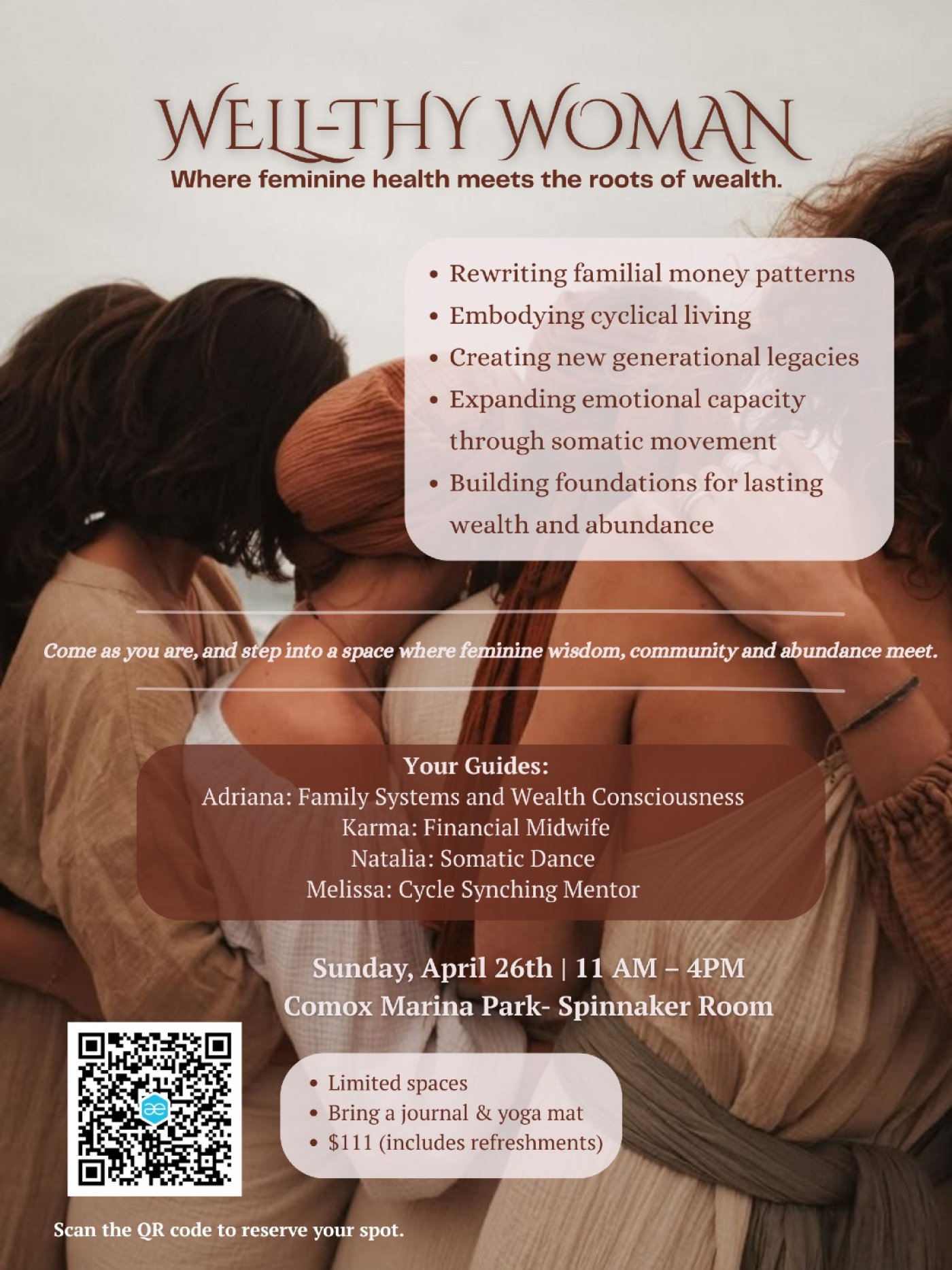 You will leave with practical tools, deeper self-awareness and a renewed sense of possibility for the way you hold, create, and grow wealth in your life.