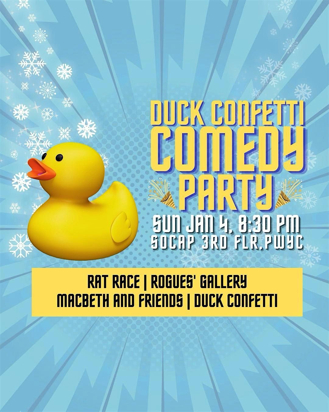 This is Duck Confetti Comedy Party, Toronto’s monthly improv comedy show, happening Sunday, January. 4, 2026, 8:30 PM at SoCap Comedy. (And every first Sunday of each month, bro)