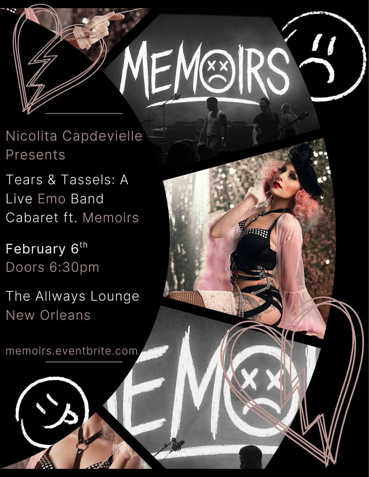 With a live set by Memoirs, performing all your emo favorites, this cabaret blends raw emotion with bold, jaw-dropping burlesque.