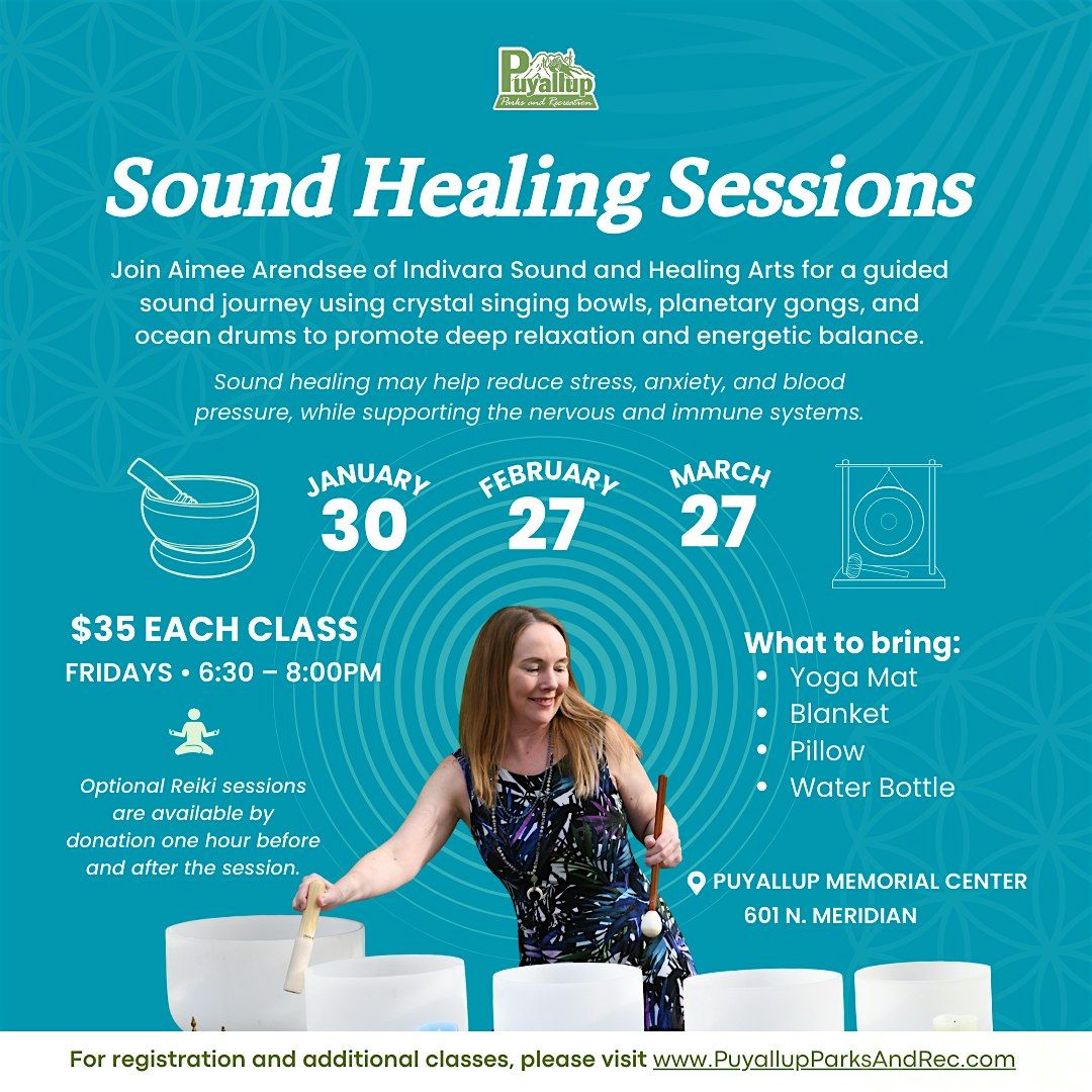 EVENT ENTRY DISCLOSURE:By entering an event or program by Indivara Sound and Healing Arts, you agree that you release Indivara Sound and Healing Arts and it's affiliates including Puyallup Parks and Recreation from all liability including financial responsibility relating to injuries that may occur during event activities.