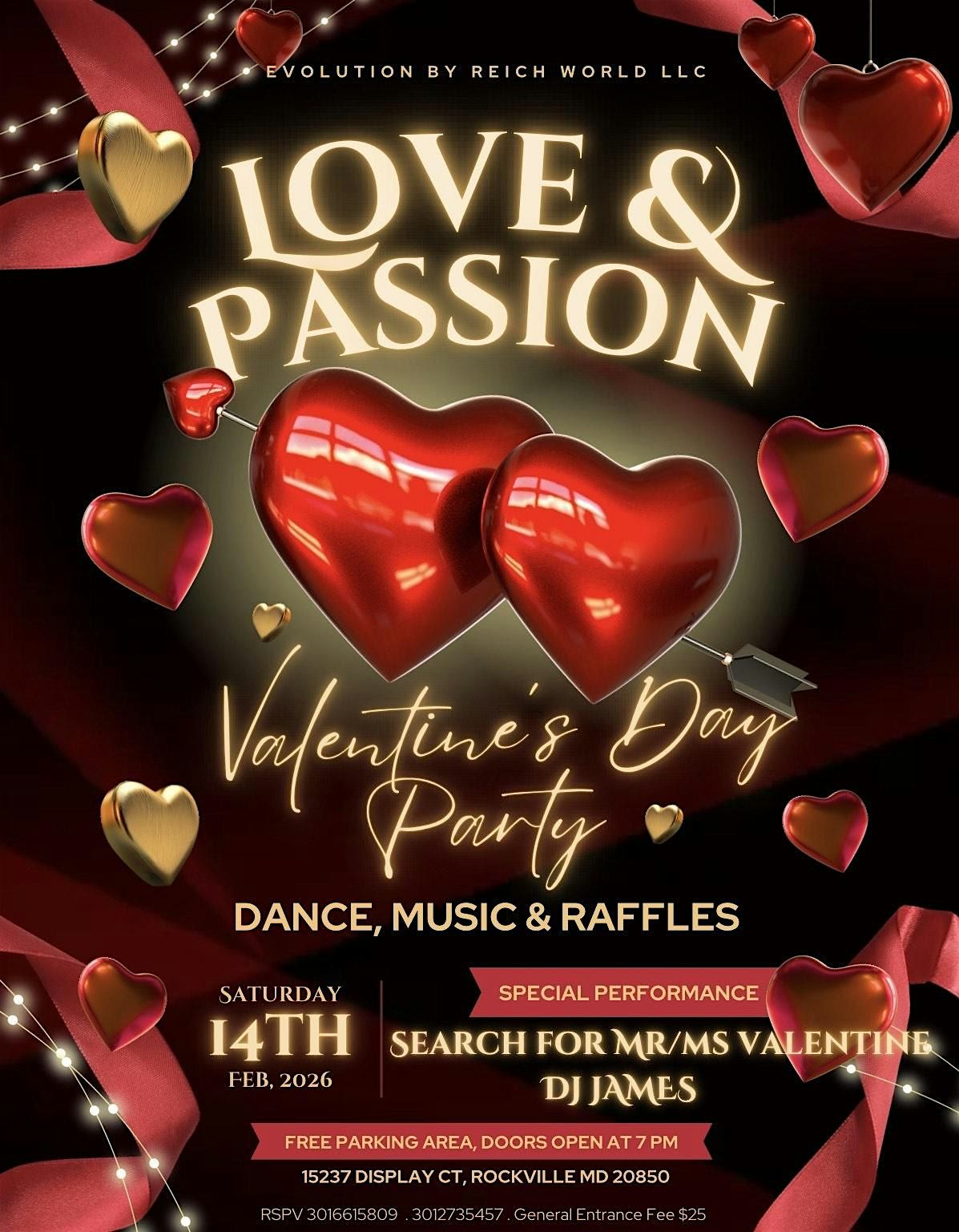 Celebrate Valentine’s Day with a night of dance, music, food, and romance! Join us on February 14, 2026, from 7:00 PM–12:00 AM at Evolution by Reich World, 15237 Display Ct., Rockville, MD 20852.