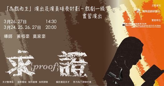 戲劇一級的實習演出《求證》,由課程導師帶領學員們共同創作。學員從劇場的行政管理、戲劇的設計及表演、後台的技術執行等台前幕後的工作輪換交替,實踐及呈現所學,親手打造屬於自己的舞台,為觀眾呈現一場與別不同的演出。