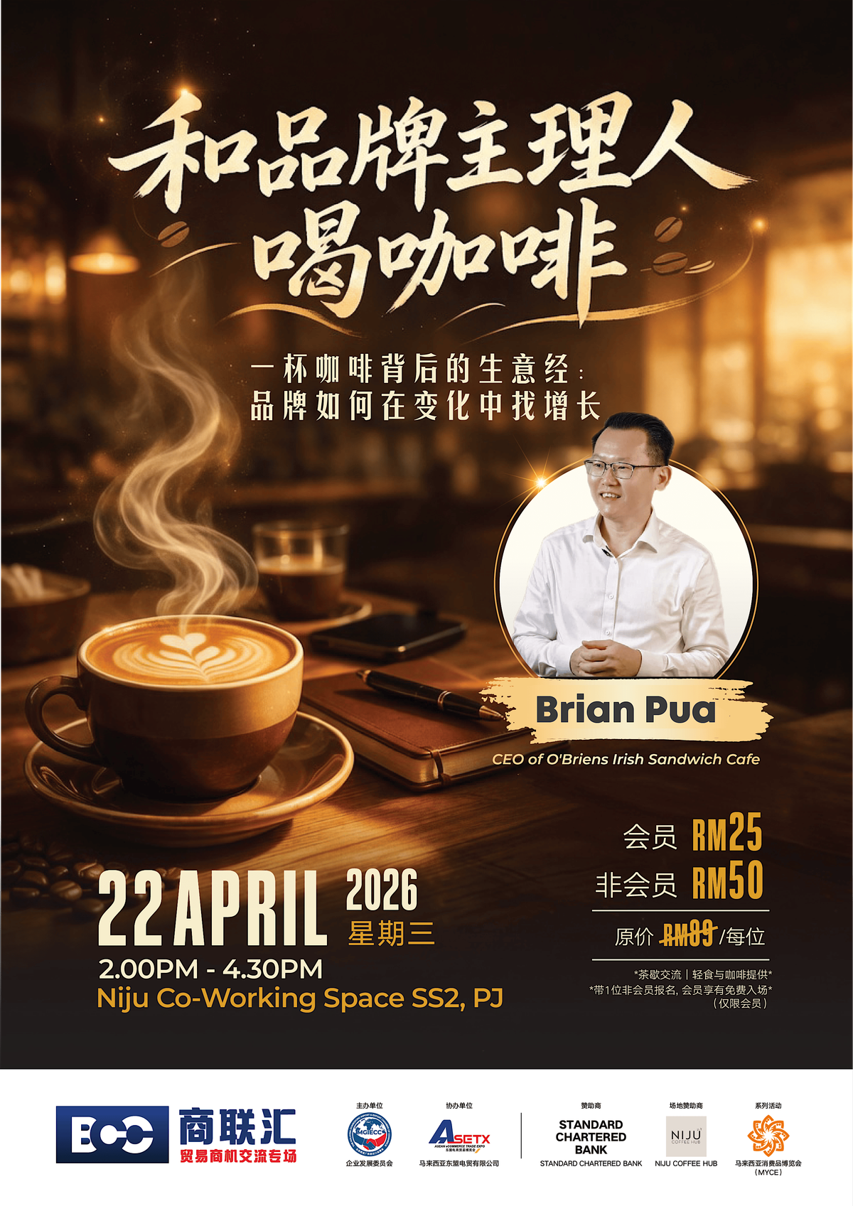 由 MGIECC 发起,邀请 O’Briens CEO Brian Pua 分享品牌增长实战经验。这不是讲座,而是一场小型深度交流,适合企业主、创业者与品牌经营者,现场也可拓展人脉与合作机会。