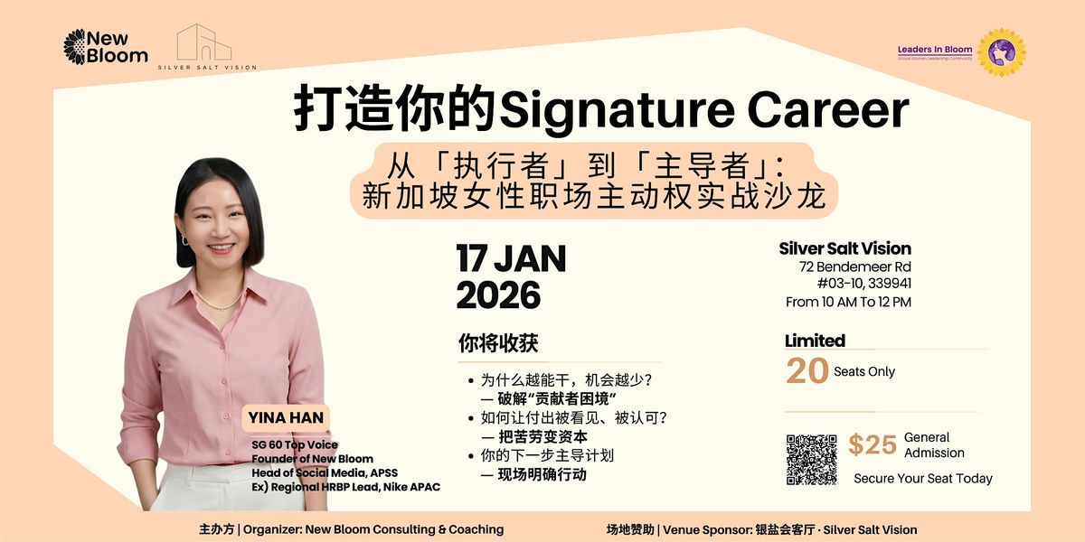 这场专为新加坡职场女性设计的实战沙龙,将帮助你打破“贡献者困境”,学会将努力转化为可见的资本,并制定出属于你的主导计划。