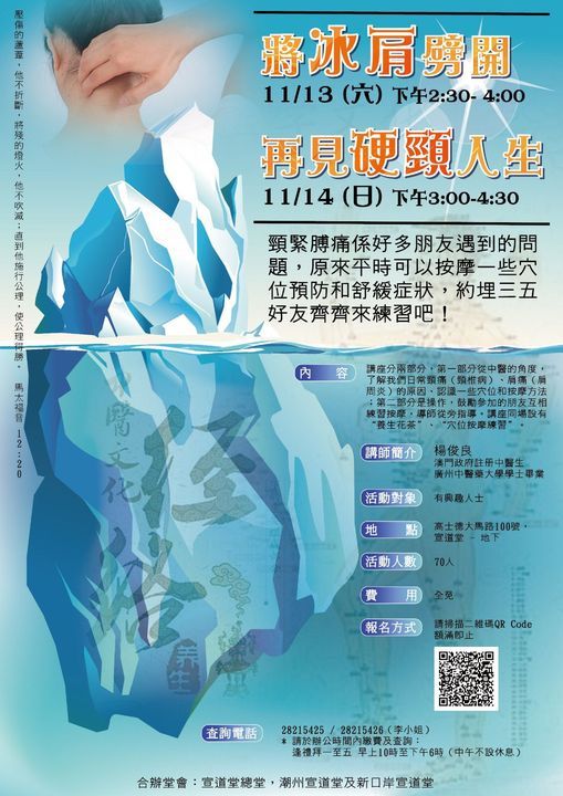 要擺脫「硬頸、冰肩」人生,就要參加楊俊良中醫生的講座啦,除咗搵出頸痛肩痛原因,仲可以學幾招穴位按摩同舒緩技巧,快啲叫埋你身邊啲「硬頸、冰肩」親朋好友參加啦!