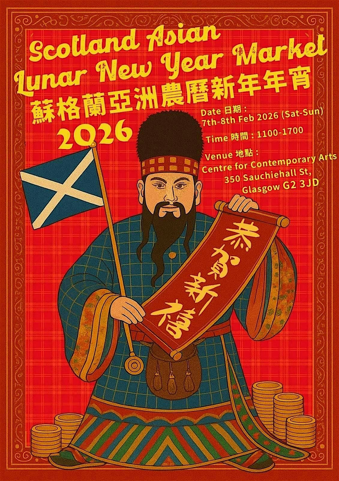 一年一度的蘇格蘭亞洲農曆新年年宵,今年移師到格拉斯哥市中心舉行,亞洲美食、手工藝品、賀年物品、攤位遊戲等等…應有盡有,現場還有精美佈置增加節日氣氛。美食、精品、歡樂、打卡 集終一身。新一年為您注滿能量。活動免費入場,時間為2026年2月7及8日 11:00-17:00,少量「快速通行證」現開放領取!如未能領取「快速通行證」者,歡迎到現場排隊參加。