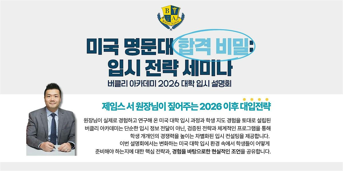 이번 세미나에서는 Berkeley² Academy의 설립자이자 디렉터인 James Seo 원장님께서 17년간의 최상위권 대학 입시 전문 경험을 바탕으로, 학생이 대학 입시에서 경쟁력을 가질 수 있도록 실질적인 전략을 공유합니다.
