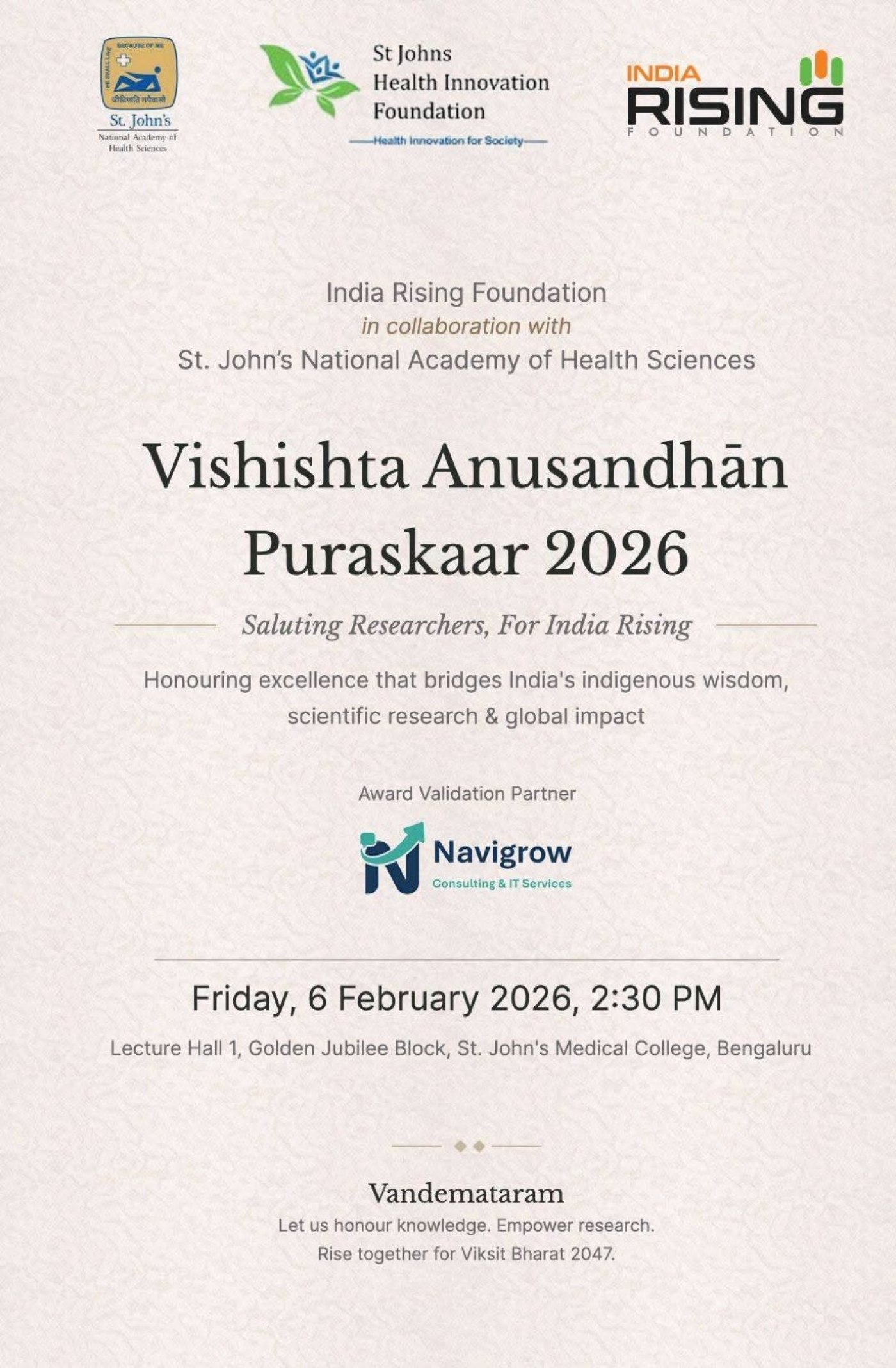 The India Rising Foundation, in collaboration with St. Johnโs National Academy of Health Sciences, proudly presents the inaugural Vishishta Anusandhฤn Puraskaar 2026โa landmark initiative dedicated to honouring excellence that bridges Indiaโs indigenous wisdom, scientific research, and global impact.