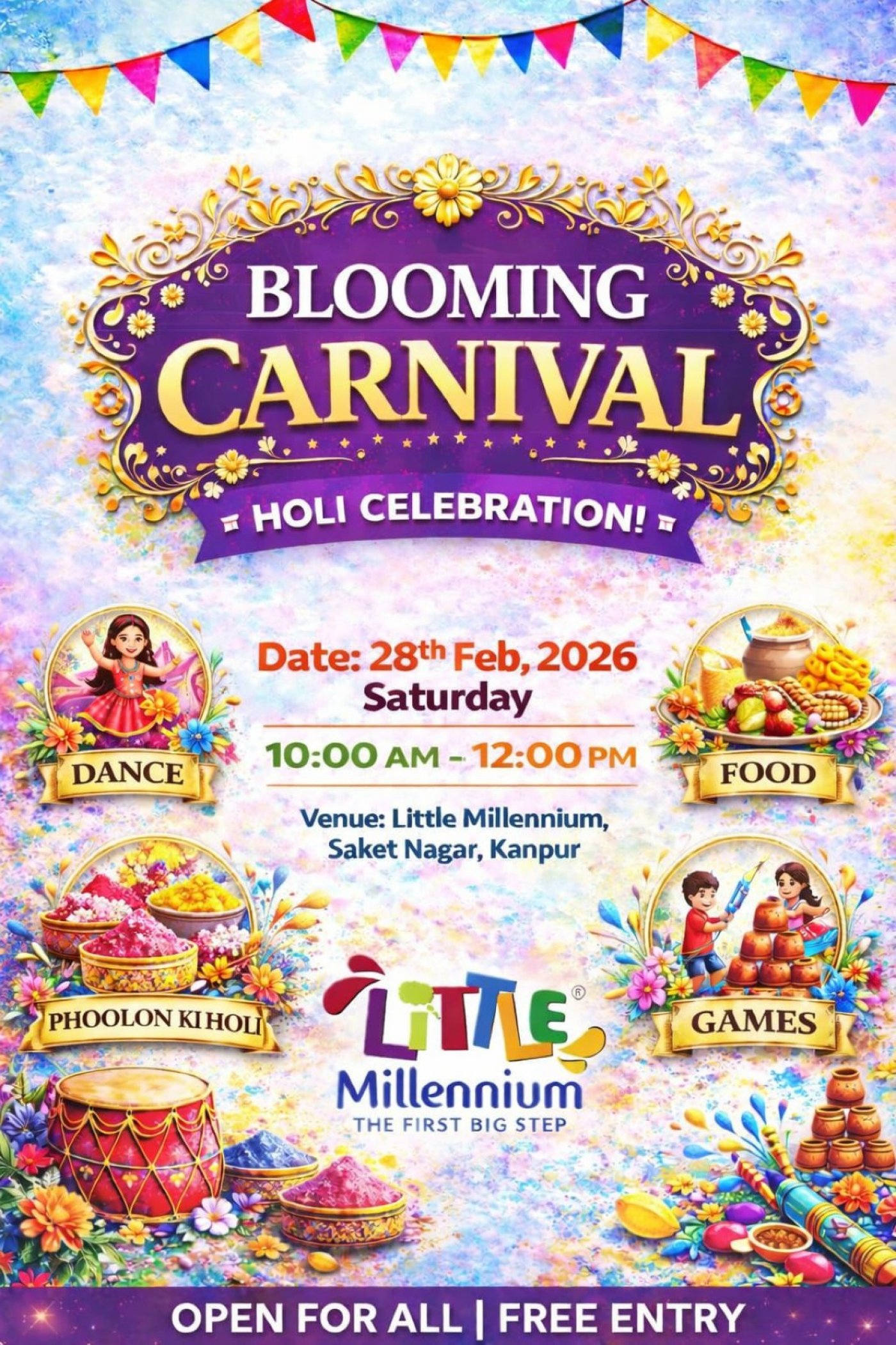 Little Millennium, Saket Nagar, Kanpur warmly invites all parents, children, and families to join us for our colorful and joyful Holi Celebration β Blooming Carnival.