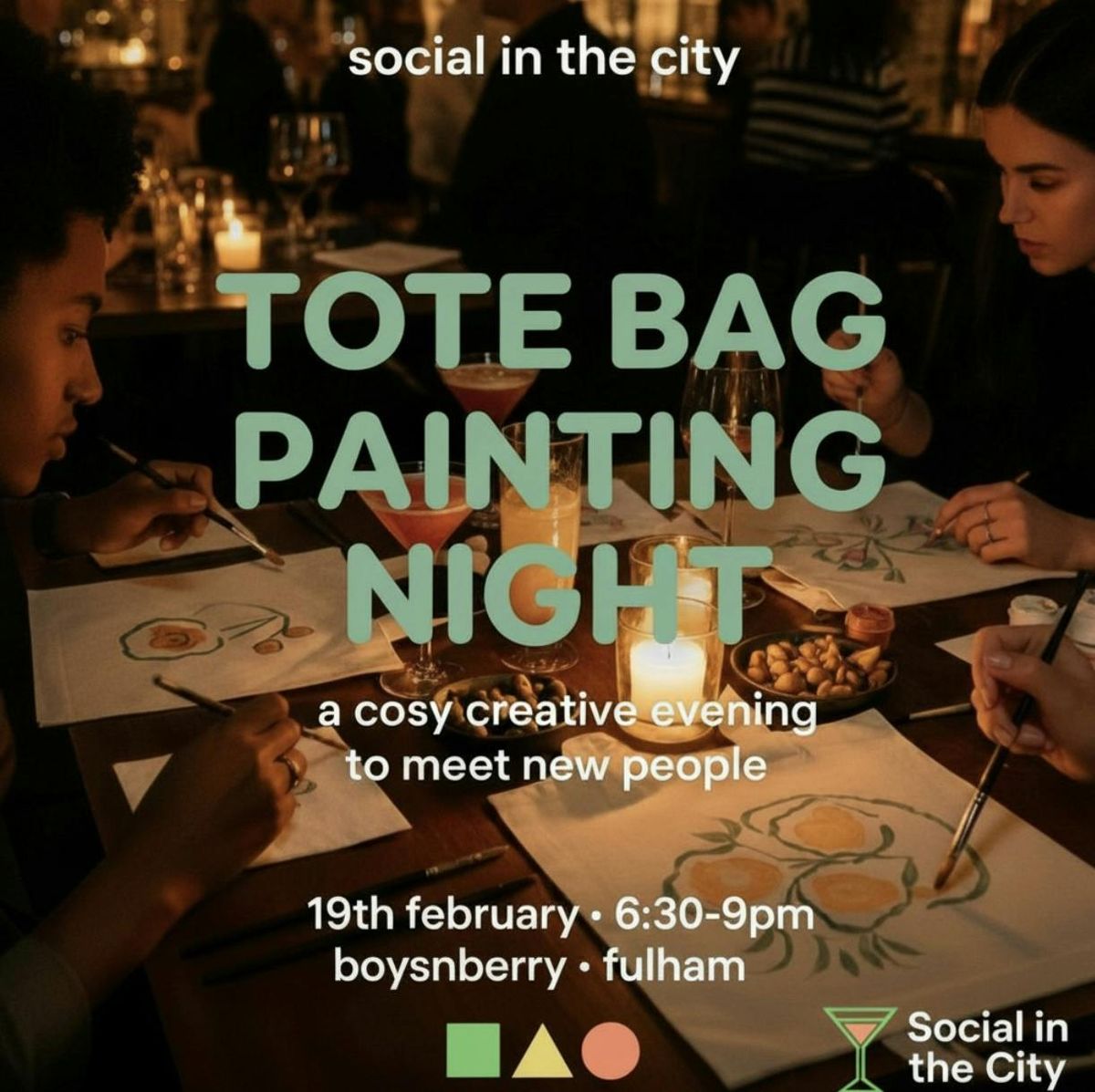 Looking to make new friends in London and do something a little different this Valentine’s season?Whether you’re single, taken, or just here for the vibes. Join us for a Valentine’s-themed Tote Bag Painting Night 💕🎨