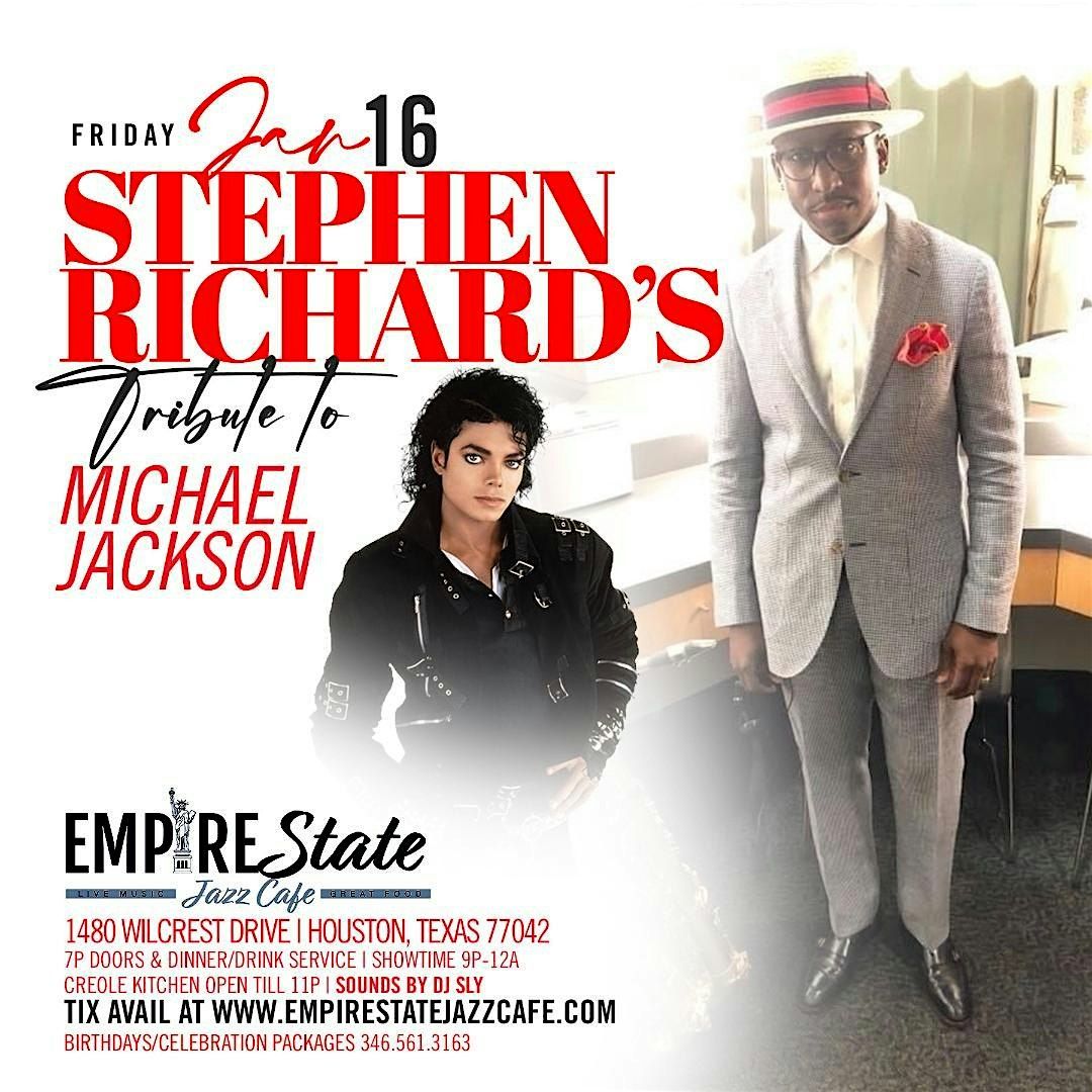 Welcome to the Empire State Jazz Cafe for a Michael Jackson Tribute featuring the talented Stephen Richard on January 16, 2026 at Door 7:00 PM | Showtime 9:00 PM (Central Time). Get ready to groove to all your favorite MJ hits in a night full of nostalgia and great music. Don't miss out on this electrifying performance that will have you singing and dancing all night long. See you there!