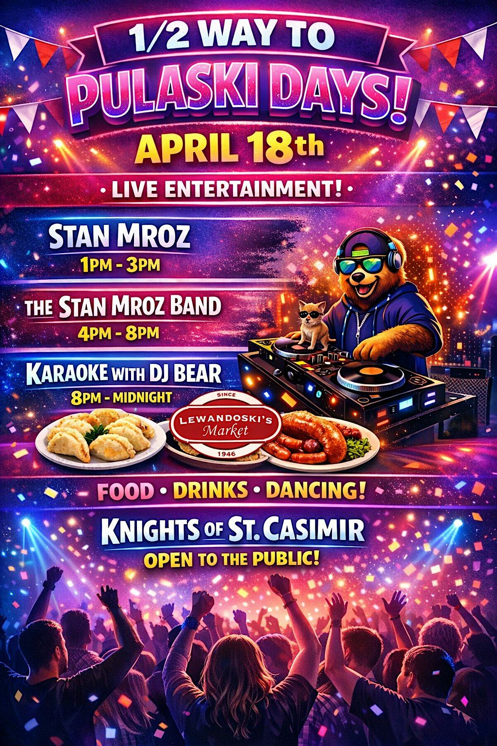 Join us for an unforgettable day! We will have live Polka Music all afternoon and evening. As part of 1/2 way to Pulaski Days festivities, we're bringing you 3 different shows. Stan Mroz will be doing a solo performance from 1-3 and his Orchestra will be joining in starting at 4pm until 8pm. Late Night at St. Casimirs will feature the our very own talened DJ Bear playing music and offering some karokee opportunities. There is no cover charge for this event its free to attend!!!