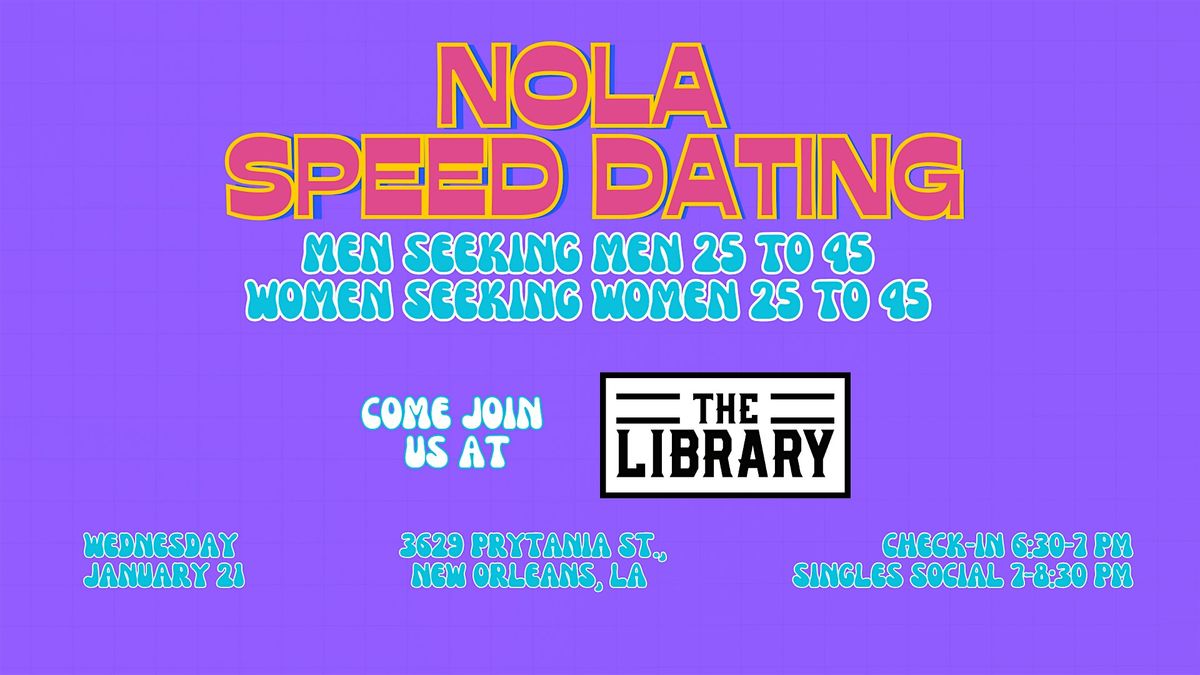 Thank you for your interest in attending a NOLA Speed Dating Event! We will be hosting this round at The Library at 3629 Prytania St. This event is designed for women seeking women and men seeking men between the ages of 25 and 45. There will be two events happening at the same time with an opportunity to mingle after.